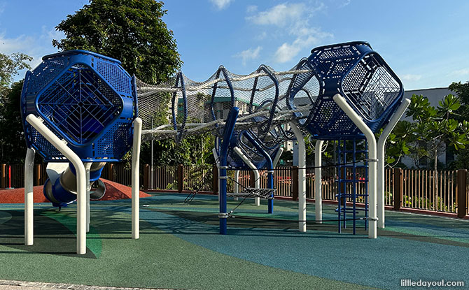 Overlooking the Ulu Pandan Park Connector, there are is yet another Clementi NorthArc climbing playground. This one features blue climbing nets and tunnels.