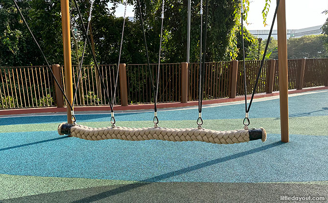 The red climbing structure has a frame is fitted with netting for children to scramble about on. They can make use of the cargo net tunnels to get onto the play structure where there are also five little “pockets” that they can pop into. Bouncy trampolines and swings can also be found close by to the Red Climbing Net Clementi NorthArc playground too.