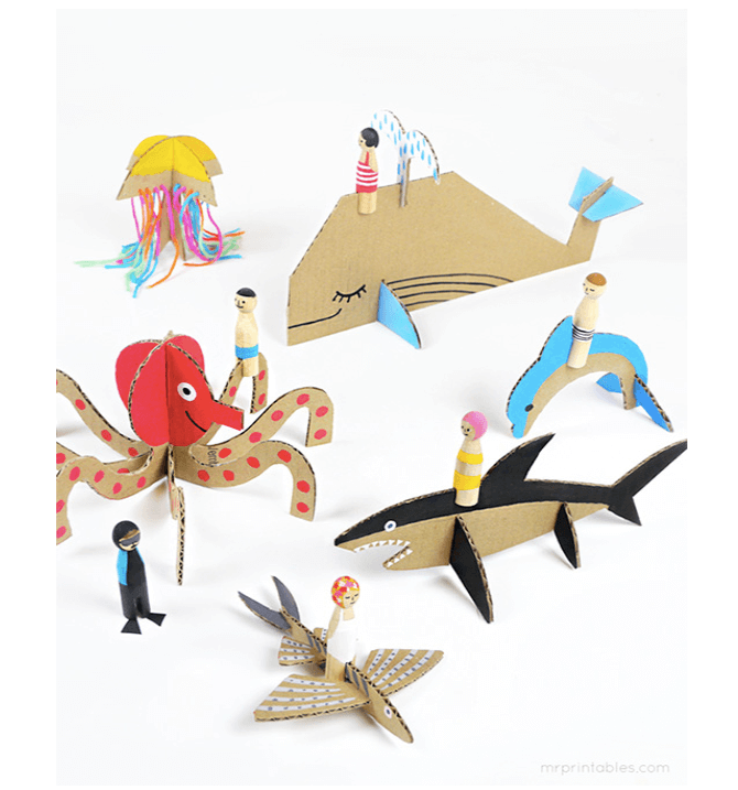 Take for instance this cardboard sea creatures craft. To achieve the final product, print the templates provided and use them to cut out the shapes of the marine animals on cardboard. Then slot the corresponding pieces together to form the creatures – no glueing is needed. What ingenuity!