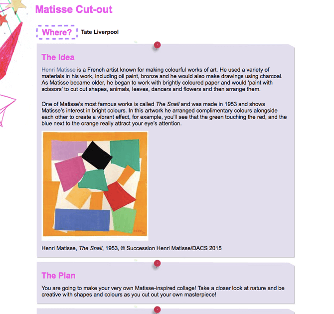 Unlike the other sites, there aren’t hundreds of craft ideas here. But each one is loaded with intent and creatively angled. There is no spoon-feeding – just an introduction to an artwork found in the museum, followed by general guidelines for art creation.