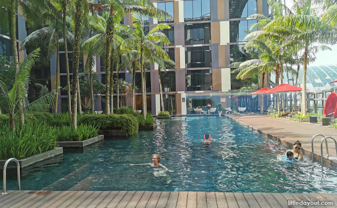The swimming pool, located at Level Three, had luscious foliage all around with gorgeous views of Jewel Changi Airport. The tropical heat made it feel almost like a beachside holiday without the sea as palm trees swayed above us.