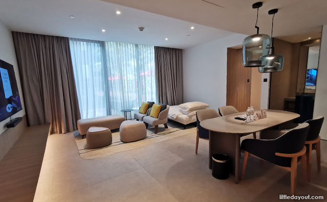 After a hectic week, we promptly entered our poolside suite, a spacious 72 sqm room with a king-sized bed, a sofa bed, kitchenette, living room, bedroom, one ensuite bathroom, a walk-in wardrobe and one toilet.