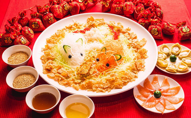 Raw fish is at the heart of the yu sheng dish, therefore, it kind of makes sense that Umisushi has a Year of the Rat Yu Sheng platter. The rat-themed umi Huat Huat Yu Sheng features the shredded vegetables with Norwegian salmon slices, arranged like a rat holding the condiments. One day advanced order is required. The umi Huat Huat Yu Sheng is priced at $98.88. Website.