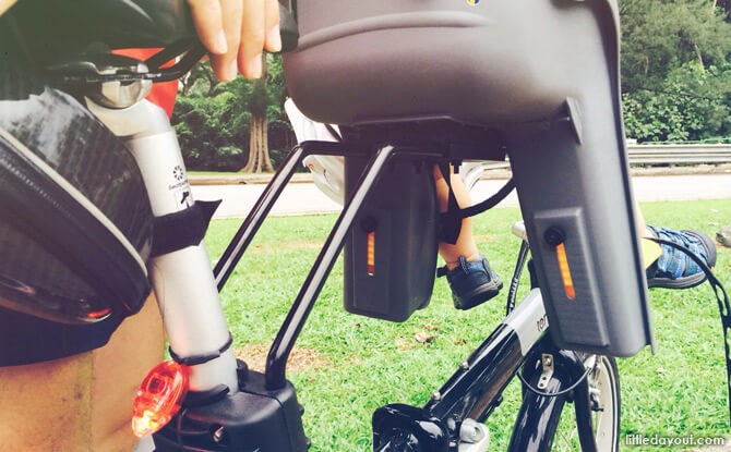 If it’s a rear-mounted seat, take note that your child’s legs do not hit the back wheel or get into the way of your heels when you pedal. The wheels of foldies are smaller than road bikes or mountain bikes, so the possibility of that happening is high.