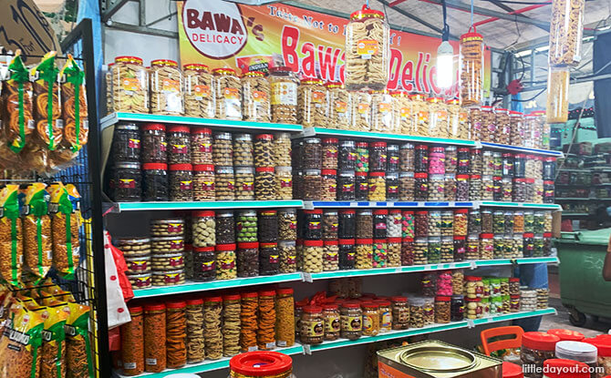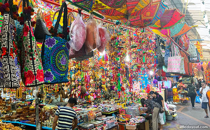Market stalls line the lane next to the Indian Heritage Centre. This covered bazaar holds festive decorations, apparel and cookies for sale.