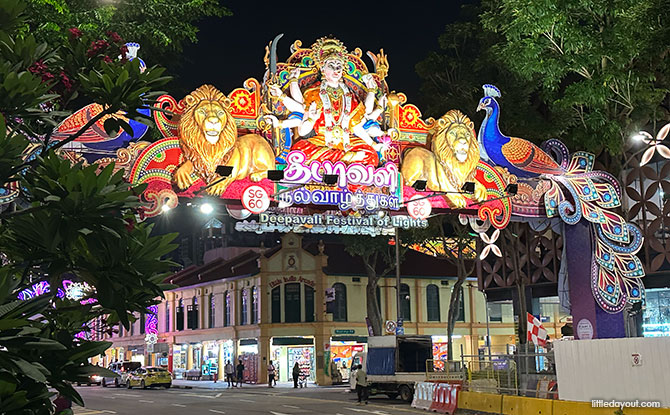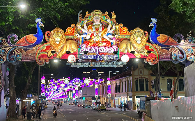 The annual Deepavali Street Light Up at Little India starts in front of Tekka Centre with a brightly coloured archway and runs down Serangoon Road.
