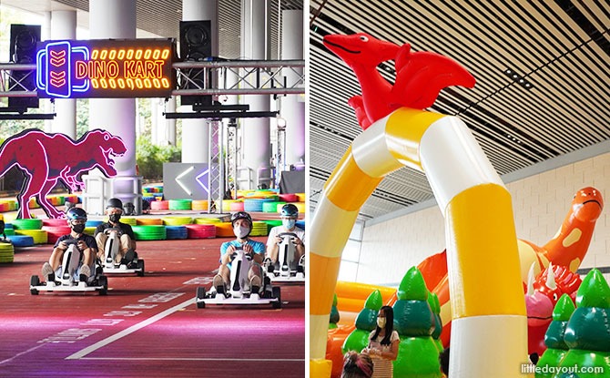 Dino Kart is open from Monday to Wednesday, 3 pm to 10 pm. From Thursday to Sunday, eve of Public Holidays and Public Holidays, Dino Bounce is open from 2 pm to 11 pm.