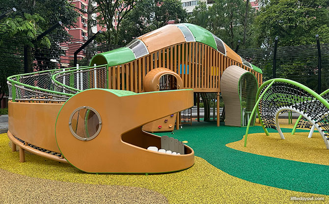 Brontosaur Park in Pasir Ris has a dinosaur-themed playground. Here, the main play structure is that of a huge dinosaur that kids can climb through. Start at the dinosaur’s head and enter through the mouth and climb up the neck and into the belly of the beast! Balancing out the head and neck of the dinosaur playground is its tail which is made up of a roller slide. There are also other dinosaur-themed play equipment that is suitable for younger kids and you can also take a walk through the garden to spot the colourful dino sculptures in the park. Find out more about Brontosaur Park.