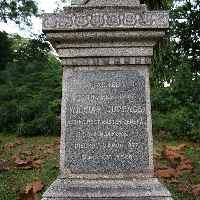 William Cuppage’s gravestone can be found in the northeast corner of Fort Canning Green, where it was relocated to from Bukit Timah Cemetery. The simple inscription on it reads “Thy Will Be Done”.