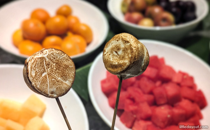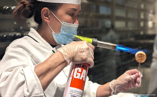Executive Chef Derrick Ang revealed that this dish was inspired by a trip to Korea, where he saw sweets like brownies and cookies encased in marshmallows. He brought the idea back to Chef Jessica, who adapted it to fit the durian theme and refined it through multiple rounds of R&D to create the version now being served.