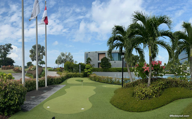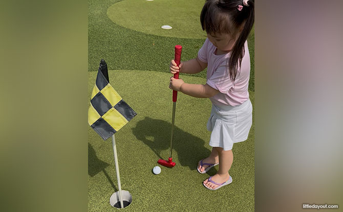 After several tries and encouragement, Little Pea was delighted to have her first hole-in-one! The surrounding view was also lush and stunning, with majestic tall flags overlooking the rolling plains of the neighbouring Laguna National Golf Course. Little Pea enjoyed watching buggies weaving up and down the gentle slopes, and real golfers in action at the practice driving range.