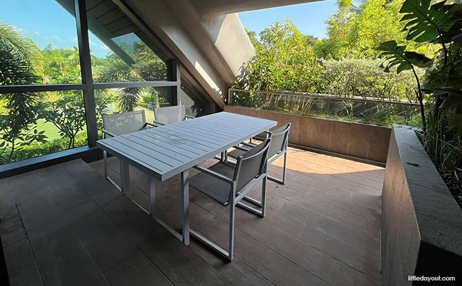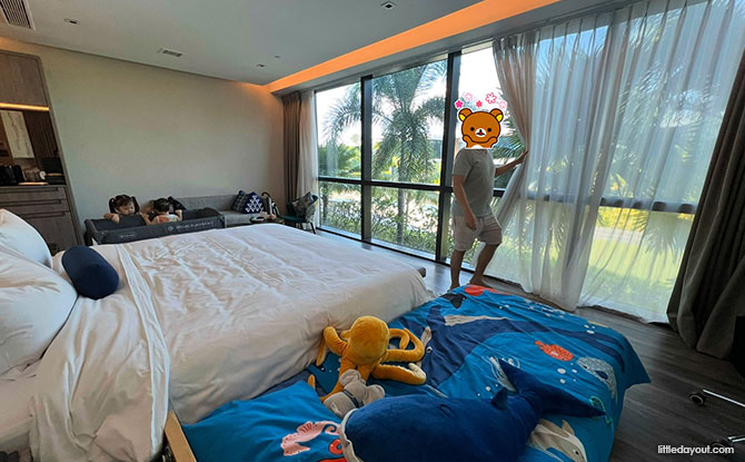 Upon entering the Dusit Thani Laguna Singapore Family Veranda Suite room (the second largest at 115 sqm) with our thoughtfully designed “Tree of Life” room card made of wood, we were greeted with a beautiful naturally sunlit floor to ceiling view of swaying palms.