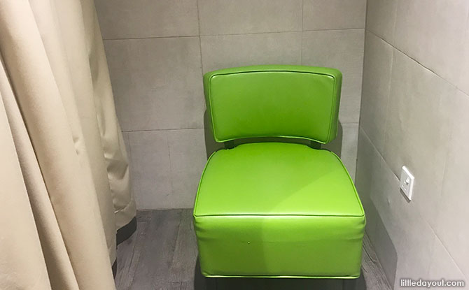 The Eastpoint nursing room is located at level 5 of the shopping centre. The space is small but fairly well-equipped with a padded diaper change mat, a sink, a hot and cold water dispenser and a cushioned bench for waiting spouses and family members. The Nursing Room also contains a separate breastfeeding area which has a comfy chair and an electrical point for nursing mothers to breastfeed or express. Although curtains can be drawn around the area, do note that privacy may be compromised.
