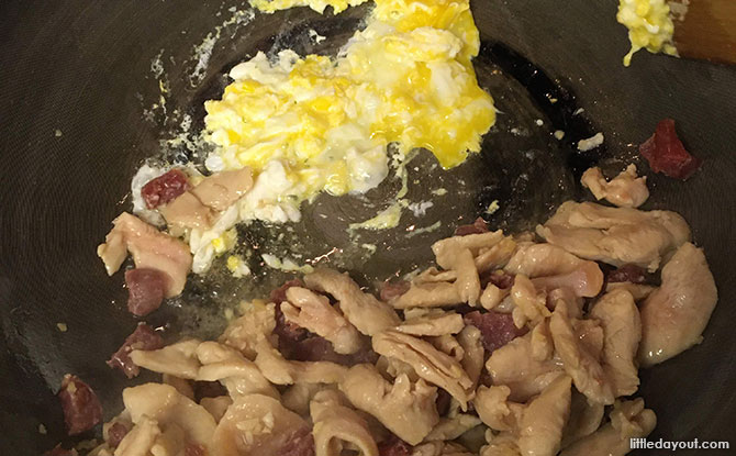 - Chicken slices should be almost fully cooked after 5 minutes. Push the chicken & sausage to one side of the wok and add in the last tablespoon of oil to the other empty side of wok, crack in the egg and cook it well before you mix all the chicken and egg together.
