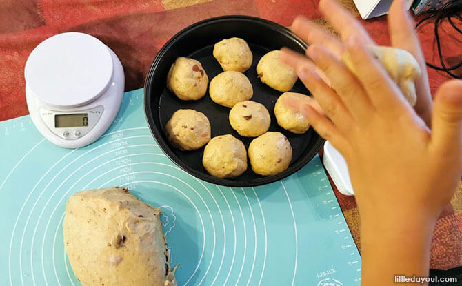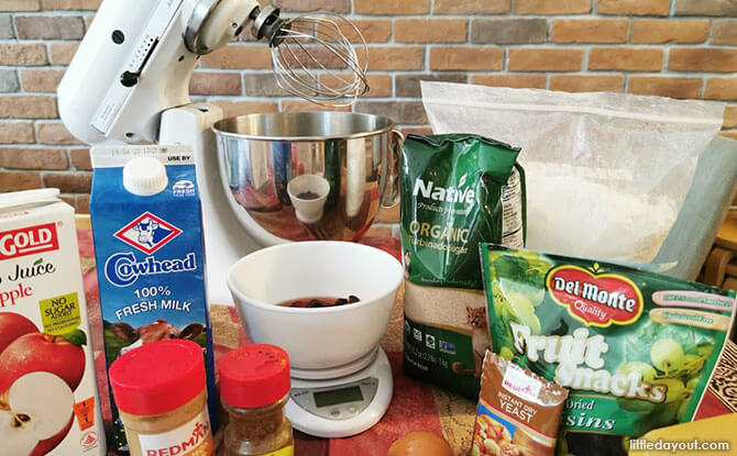 Then, mix in dough ingredients without fruit, knead mixture till dough is soft and elastic. You can use either a kitchen mixer or a bread machine. Then mix in the fruit. Kids will love measuring and pouring in the ingredients. It is also a good way to practise scoop and pour, measuring and learning about weight and fractions.