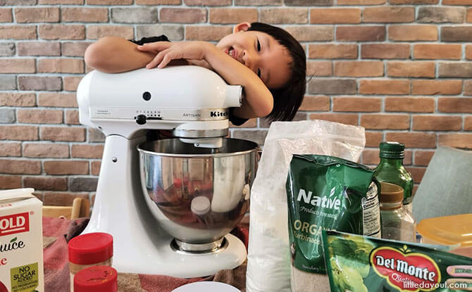 Who doesn’t remember the song “Hot cross buns, hot cross buns, warm and yummy, hot cross buns!”? Since everyone’s home, we thought baking some hot cross buns for Easter would ward off the cabin fever, occupy the tiny hands, practise some scooping and pouring and learn some math too. We found the easiest hot cross buns recipe off King Arthur – which is mainly letting the mixer do the work and us waiting.