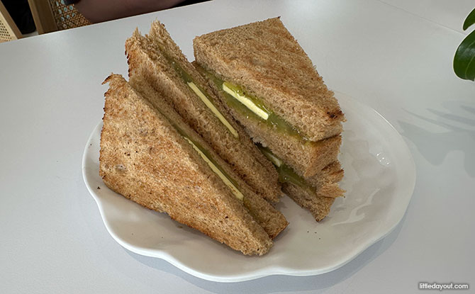 We ordered the kaya toast. This arrived shortly and featured decently thick bread that had been nicely toasted to a brown exterior. In between the two pieces of bread was a generous layer of green kaya. A thick slab of creamy yellow butter added a touch of decadence to the plate of kaya toast. Soft boiled eggs are also available but we did not order them.