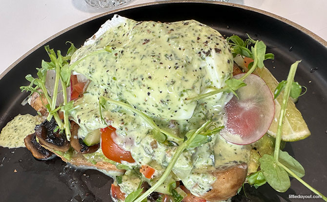 The Avocado Toast Delight ($16) features a creamy avocado spread on top of slices of sourdough toast. This was topped off with a poached egg and sauce. It is dressed with some salad and mushrooms too.