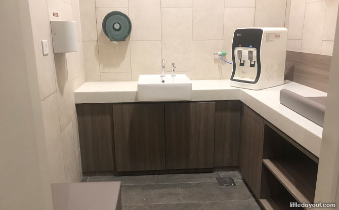 The Baby Care Room at E!Avenue @ Downtown East is small but decently furnished. Equipped with a bench, sink, hot and cold water dispenser, electrical point (located next to the hand dryer) and a padded diaper changing station, the room houses all the family-friendly facilities needed for a quick diaper change or feed. The room is also lockable, making it a safe haven for nursing mothers to breastfeed or pump privately