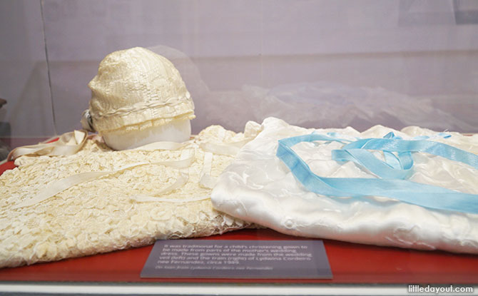 On display are personal items such as a baptism gown and tableware. These provide a look at into the domestic and family life of Eurasian households.