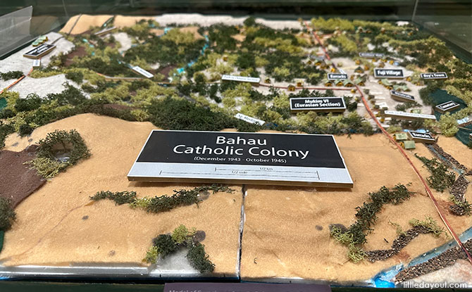 Here, you can also find a model of the Bahau Catholic Colony. This was an area in Negeri Sembilan that was established by the Japanese authorities during World War II. It was a scheme where people, especially from the Eurasian community, were resettled out from Singapore to live in an agricultural settlement.
