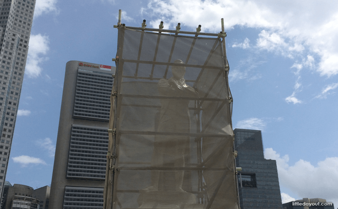 A good place to start is the statue of Raffles, located at the spot where he is believed to have stepped on to Singapore’s shores. Except, as of August 2015, the white statue is shrouded in a veil of netting as construction works go on around it.