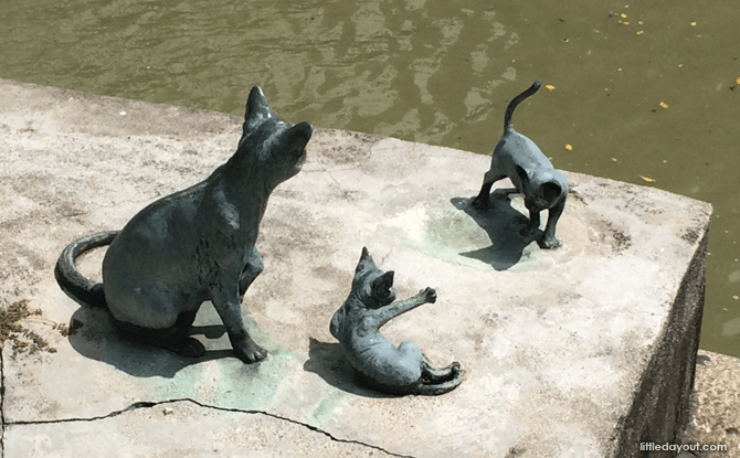 On the other side of the same bridge is a blink-and-you’ll-miss-it collection of three cats. These depict Kucinta Cats, a Singapore street cat. They were once part of a group of 15 cat sculptures cats placed around the Singapore River. Read 9 Feline Facts about Cats in Singapore.