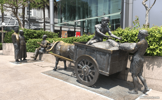 The River Merchants is found in front of the Maybank Building. It depicts Alexander Laurie Johnston, a Scottish merchant in early Singapore in discussion with a Chinese trader and Malay Chief. Nearby, Indian and Chinese coolies load a bullock cart, once a common sight along the Singapore River.