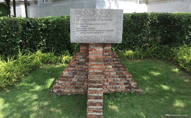 The Foundation stone for the Monument to the Early Founders of Singapore was laid by Singapore’s first President, Mr Yusoff Ishak in January 1970. Funding for the monument ran out and all that remains is the foundation stone. It can be seen next to The Fullerton Hotel today.