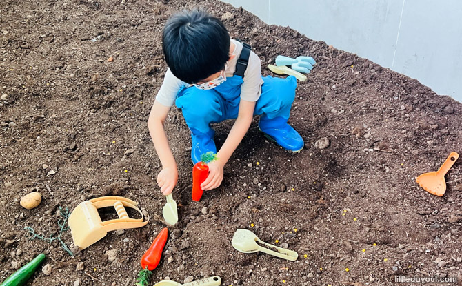 To get into the “dirt” of it, kids are also provided with realistic farming straw hats, water proof boots and overalls for soil and water play, along with free use of towels and access to an on-site wash basin.