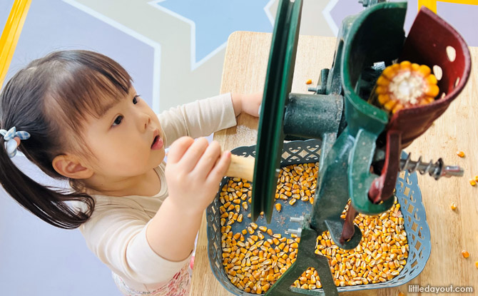 Knowing she has to earn her popcorn, Little Pea moved on to work the rotary handle at the “Corn Cutter Tables”, and looked in amazement at the kernels collected.