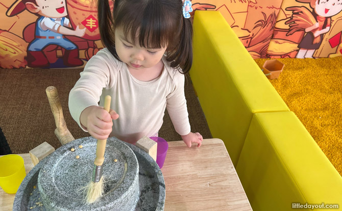 Eager to earn her soybean milk, Little Pea went straight for the stone mills. She peered inquisitively into the hole of the stone grain mill as she worked her little muscles to grind the soybeans provided.
