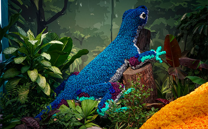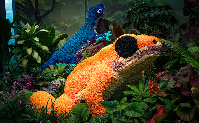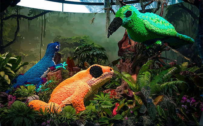Sheets of falling water mark the start of Waltz, the next thematic area at Floral Fantasy. Reminiscent of a rainforest, Waltz is also where a vivarium of poison dart frogs can be found.