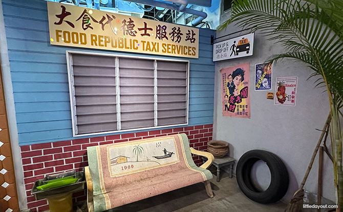 Another corner has a “Food Republic Taxi Services” kiosk, complete with wooden panelling and a stone bench. This is a throw back to the days when there used to “radio taxi” kiosks around the island that coordinated the booking of the taxis.