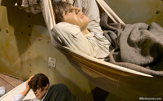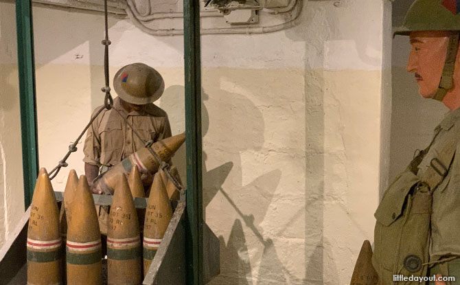 From the arrival point from the Fort Siloso Skywalk, head straight and climb the stairs to the Battery Command Post. This display, along with others, depicts what it was like when Singapore was at war.