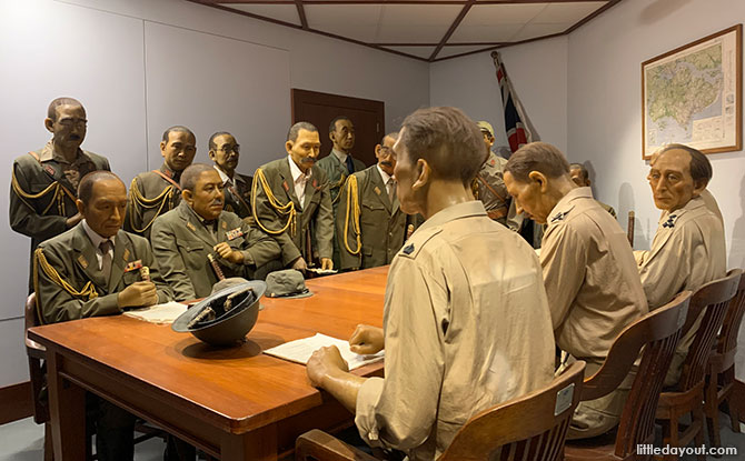 The Surrender Chambers contains wax figures that show two surrenders that took place in Singapore. The first is that of the British surrender to the Japanese, which took place at the Former Ford Factory at Upper Bukit Timah Road.
