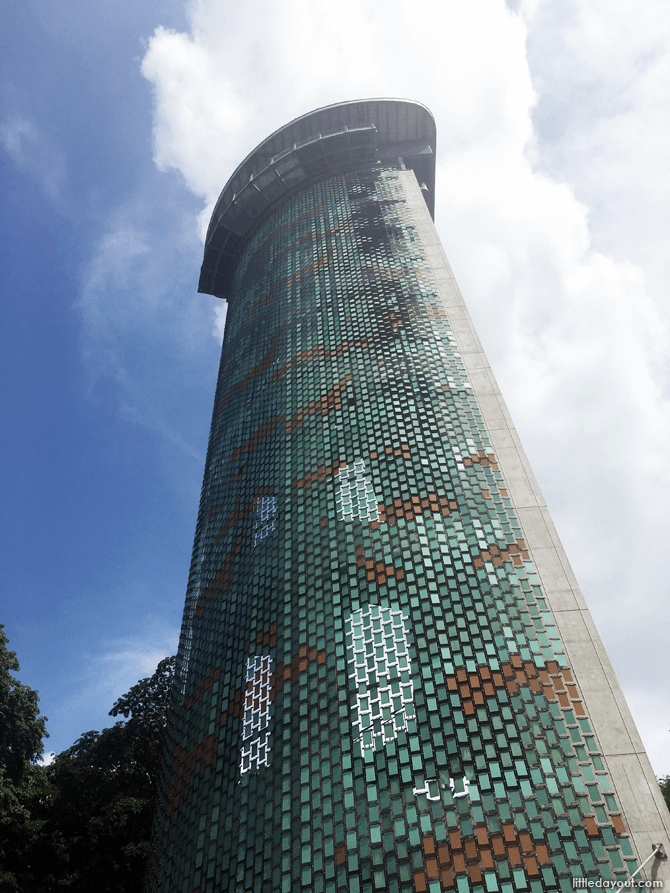 Entry to the Fort Siloso Skywalk is at the start of Siloso Road. It is impossible to miss the imposing 43-metre tall tower, cladded with camouflage painted metal sheets.