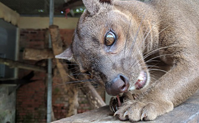 Fossa are a carnivorous mammal with a cat-like head, a muzzle that resembles a dog and a long body that looks similar to a mongoose. It is a native of Madagascar where it lives in forested areas. Beside rodents and rats, one of its favourite prey is – as portrayed in the movie Madagascar – lemurs.