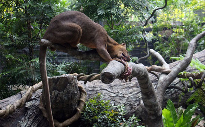 The fossa exhibit at Singapore is designed to replicate the foosa’s natural habitat. The exhibit has been designed to include dynamic branches. In contrast to older, static designs, dynamic branches are spring loaded and move with the weight of the animal, similar to the way that natural branches behave.