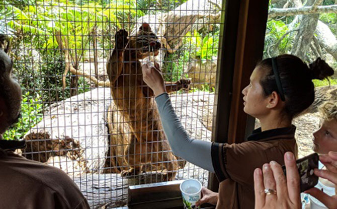 Visitors to Singapore Zoo can look forward to daily interactive sessions. The fossa exhibit at Singapore Zoo is designed with sliding panel that opens up to a mashed window. This allows keepers to access the fossas from the public area to carry out conditioning sessions and affords visitors a chance to get an upclose experience of the animals.