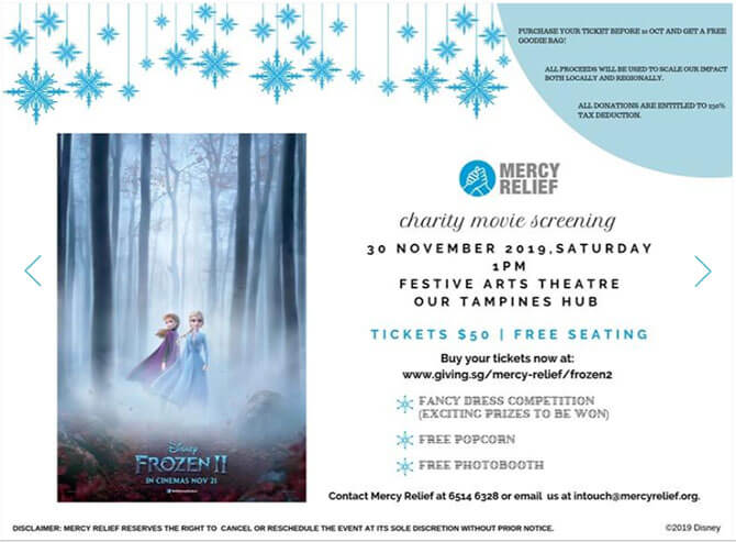 Mercy Relief is an independent disaster relief agency in the region to respond to human tragedies and disasters. All proceeds from ticket sales to the Frozen 2 screening on 30 Nov will help scale Mercy Relief’s impact and reach out to more communities in needs. Donations of $50 and above will grant donors movie tickets, popcorn and drink combos and photobooth opportunities. There is also a fancy dress competition! So dress up and gather your troop to this screening.