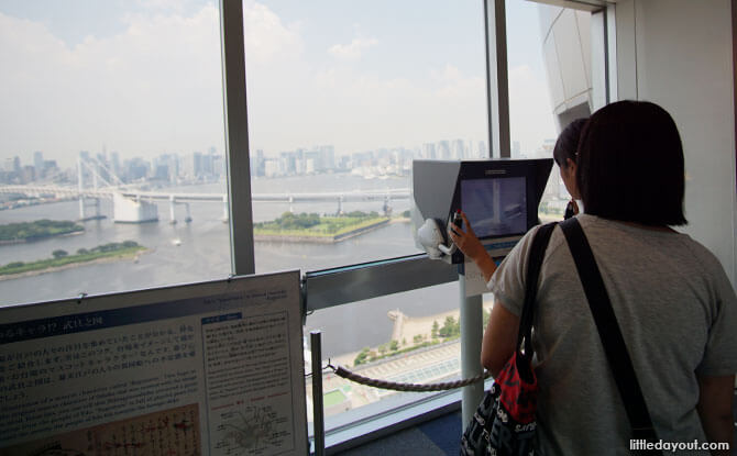Here, there are special observation cameras which allow you to zoom in to the view of the Rainbow Bridge and the Odaiba shoreline below. Press a button and you will be able to get a view of Odaiba as it was during the Edo period, giving you a historical perspective of the area.