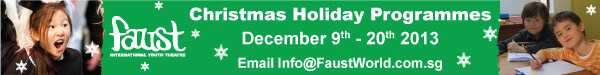 Parents can call 6235 3582 to register for a free trial drama workshop on 7 December 2013 for ages 4 to 16. Christmas Holiday Programmes take place from 9 to 20 December 2013 and Term 2 begins on 11 January 2014.