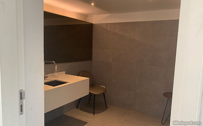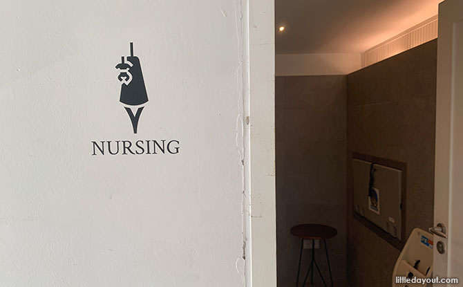 Inside the Gallop Extension, Singapore Botanic Gardens, Nursing Room there is a seat for moms. Other facilities include a fold-down diaper changing table and a seat for kids.