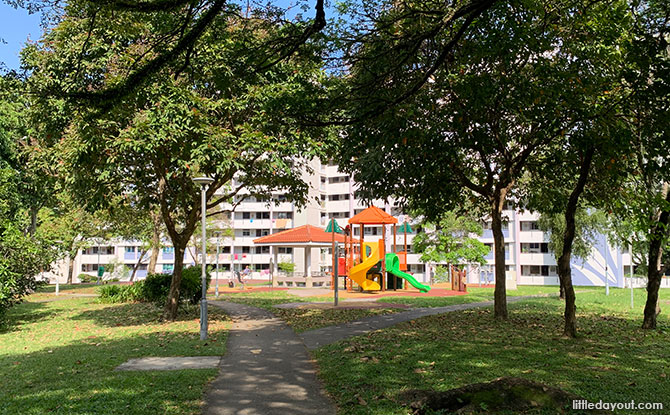 In addition to the Garden Hill Park playground at the summit, along the slopes at the base of the hill, facing out towards Bedok North Street 1, there is another playground beside Block 419.