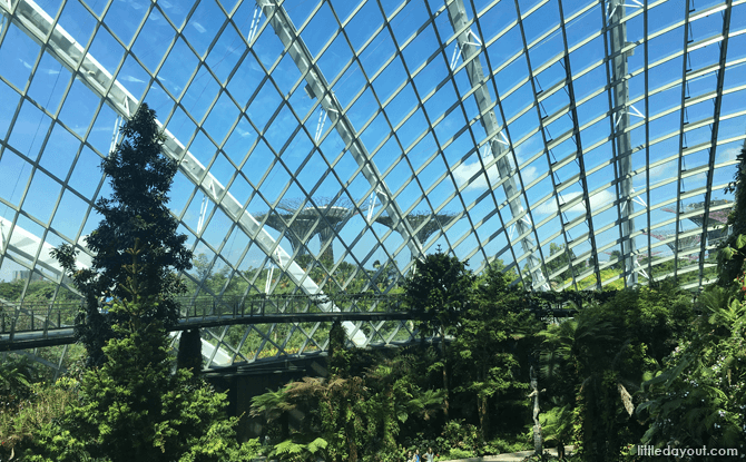 This metal walkway will take you out towards Gardens by the Bay Cloud Forest’s glass dome and offers a wonderful view of the outdoor gardens and children’s playground.