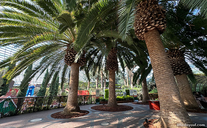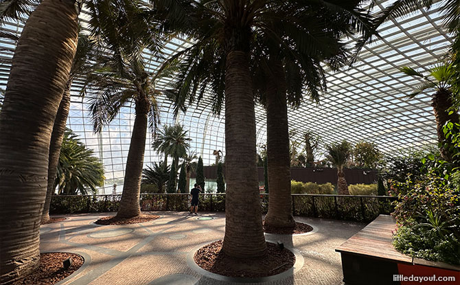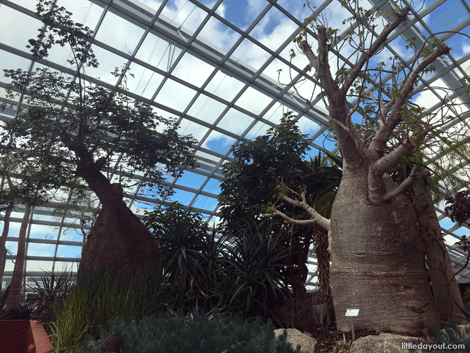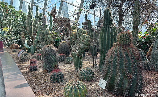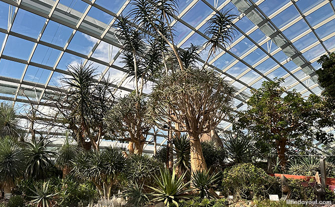 The Succulent Garden in the Flower Dome feels like a desert, just not as hot. It’s filled with a variety of succulents, like cacti and aloes. These plants are used to dry places and have special features to stay alive, like spines and a wax layer.