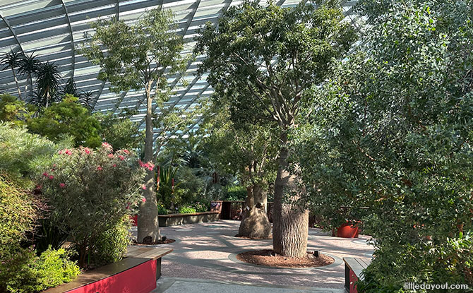 To the left of the entrance into the Flower Dome is the Australian Garden. Just as Australia has a unique fauna all its own, its cool-dry deserts support unique flora too. Amongst the plants that are on display are those from Western and South Australia’s deserts. The plants have needle-like leaves and protective coatings. These help them survive wildfires and the tough outback.