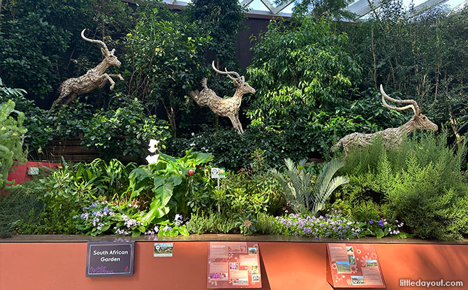 Follow the Tropic of Capricorn to the South African Garden. The South African Garden in the Flower Dome at Gardens by the Bay showcases plants unique to the area. These plants, called ‘Fynbos,’ are known for their tough features. They have leafs that look like needles and dark leaves that keep moisture. They grow well in sandy soil with few nutrients.