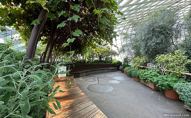 California’s Mediterranean climate is known for its wine and citrus fruit. Climb up the steps to the Californian Garden where can take a seat under a canopy of grapevines.